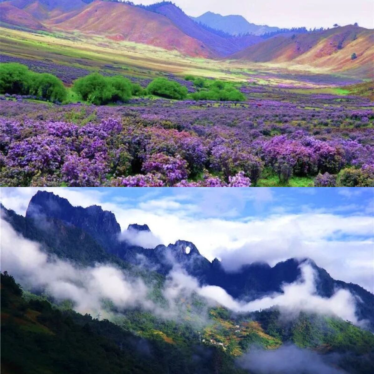 琢成赤壁丹崖的壮丽奇观——石峰如柱如塔,姑娘山巍峨耸立。夏季来临之时,大羊场高山草甸上杜鹃花