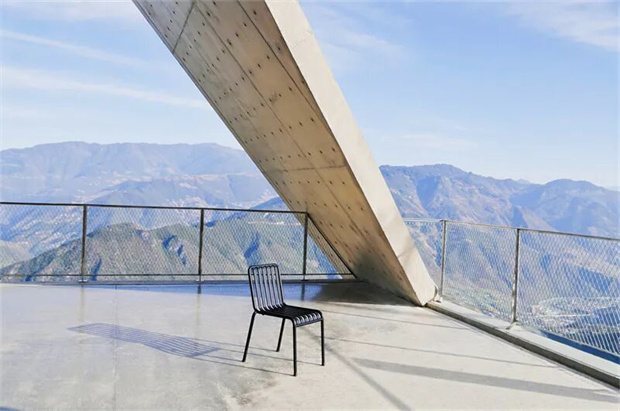 从蜿蜒山道盘旋而上,抵达怒江州泸水市阳坡村。形似弓弩箭头的前卫建筑嵌在悬崖之上,简洁的几何形态回应峡谷的