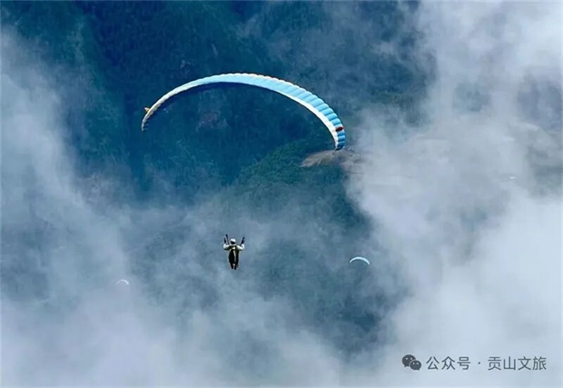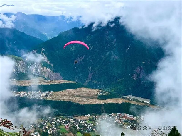 乘滑翔伞从贡当神山起飞,在高空俯瞰云雾缭绕的丙中洛坝子,怒江如碧绿丝带缠绕山间。风声掠过耳畔,脚下是村寨、