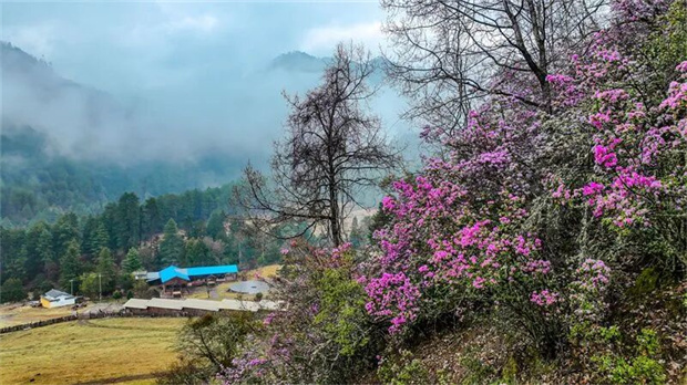 寸山野山间杜鹃次第绽放,漫山铺展,粉紫嫣红缀满坡地与崖边,将雄奇山峦晕染得温柔诗意。