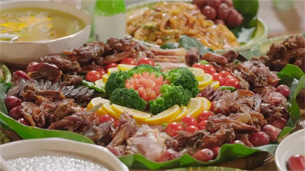 被誉为“峡谷风味”代表的傈僳族手抓饭。芭蕉叶为盘,盛放着草果炖鸡、老窝火腿、烤乳猪等特色佳肴,色彩斑斓如民