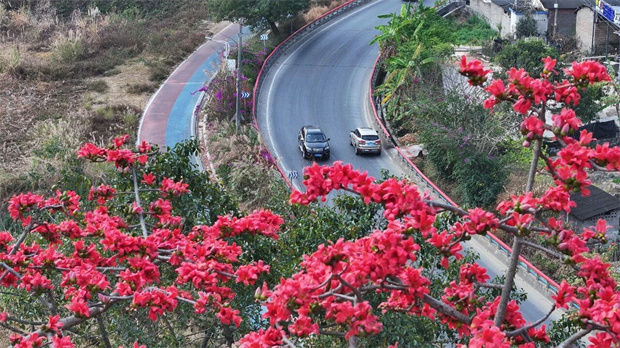 春风拂过峡谷大地,近日,泸水市街头巷尾,熟悉的木棉花悄然绽放。一树树红霞似火,铺满天际,将怒江的春日画卷