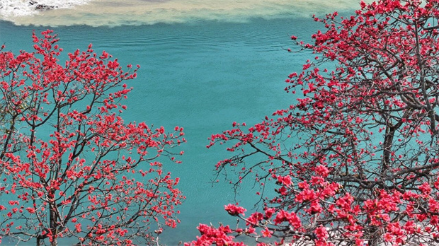 色彩;有的花蕾满枝,陆续绽放星星点点的红花,在蓝天、白云、碧江的映衬下,更显得娇艳无比。来自四川的游客开